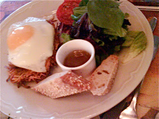 老爸點的蘑菇薯餅,薯餅脆脆的,很特別。黃金蛋很香,很有有機的感覺。下方的手工麵包非常有嚼勁,還有陣陣的芝麻香。